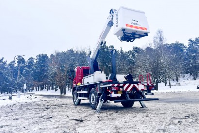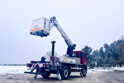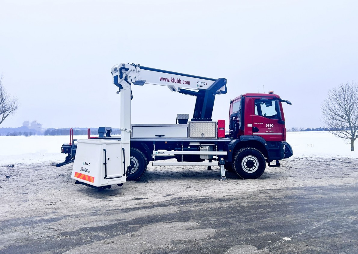 For electrical line maintenance operations, the customer was supplied with a specialized KLUBB Xtenso4 truck-mounted aerial platform. The KLUBB Xtenso4 aerial platform mounted on a MAN TGM chassis is distinguished by advanced technical features and high reliability.