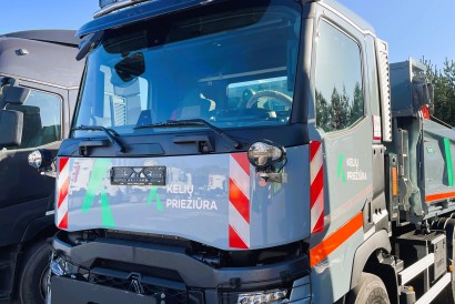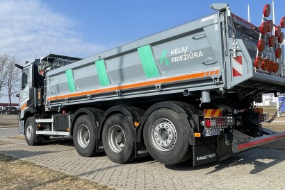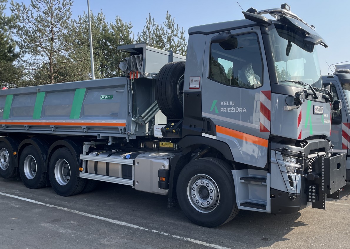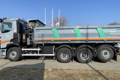 For the first time in Lithuania, four-axle Renault CP8X4*4 TRIDEM three-way tippers are being deployed for national road maintenance operations. To ensure safe and ergonomic operator conditions, the vehicle bodies are equipped with remote-controlled electric tarpaulin systems and pneumatically operated rear underrun protection devices, specifically designed for asphalt paver compatibility.